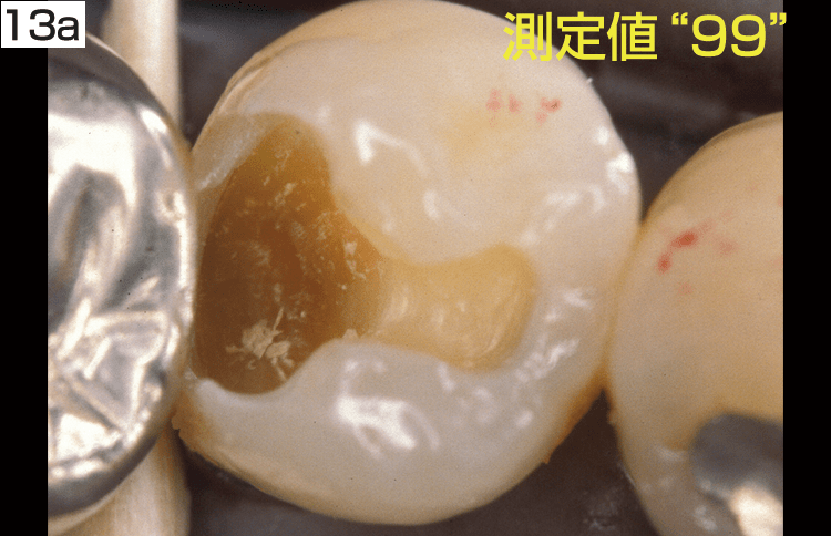 著者らの基礎的な研究や臨床的な経験では、ダイアグノデントの測定値が10以下になれば、検知液の「薄いピンク染」に染まる歯質にほぼ一致すると考えていて、ダイアグノデント ペンの一つの活用方法になると考えている(図13a,b,c)。