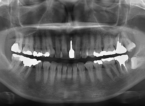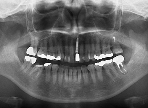 患者は、ブリッジよりもインプラント治療を選択したため、インプラント治療を含めた一口腔単位の治療計画を提示した。根尖病巣による感染を防ぐために、8週間の治癒期間をおくこととし、その間は、接着性のテンポラリークラウンを装着することとした。