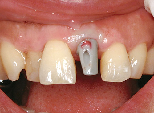 図18 ジルコニアクラウンの試適。アバットメントは、歯肉に調和する形態を意識した。歯肉を圧迫しすぎてはいけない。 -