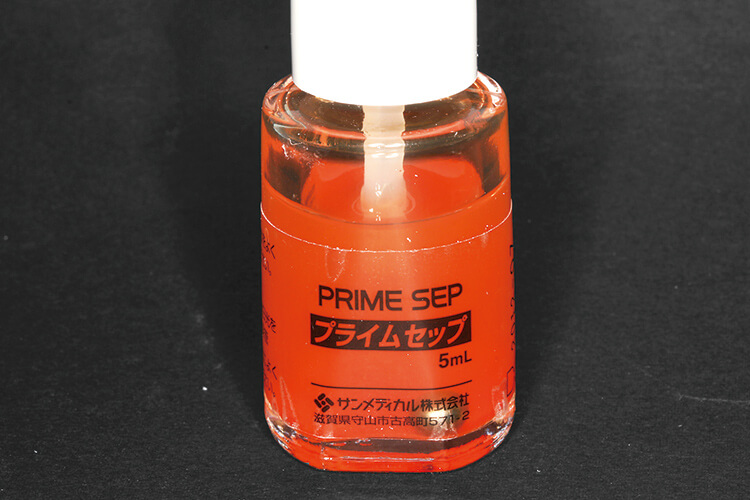 一方、光ファイバーポスト先端部にテーパーなどの修正を加えた場合には、エッチング処理(表面処理剤レッド / サンメディカル)後、シランカップリング処理(ポーセレンライナーM / サンメディカル)を施す必要がある(図4、5)。