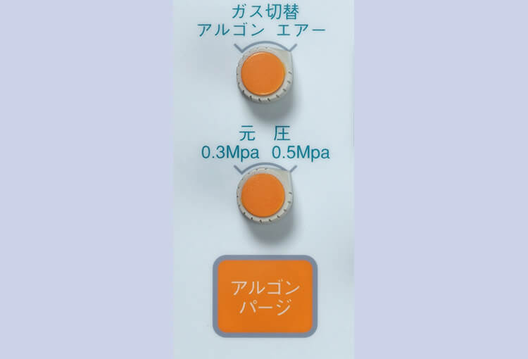 図10 上:ガス切替ツマミ アルゴンガスを接続した後、エアーとアルゴンガスを簡便に切替ができ、鋳造時に加圧する気体を選択することができる。