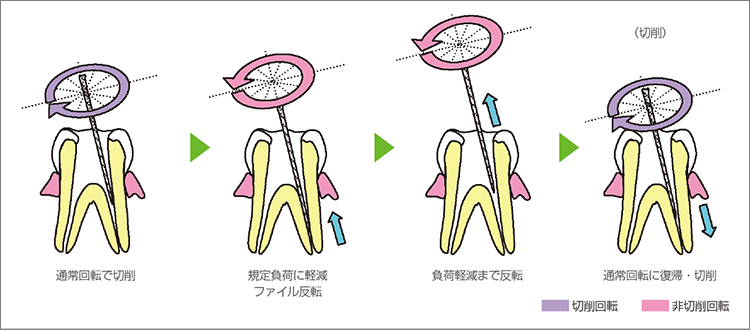 OTRは、従来のトルクリバース機能(図2)とは異なり、ファイルにかかる負荷が一定の値を超えると約90度反転し、その後約180度通常回転するというものです(図3)。
