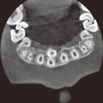 図5b 初診時CBCT水平断像。切歯管や永久歯、鼻腔底との位置関係が容易に把握できる。 -