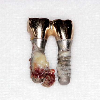 約30年前に他県で67部、765部に計5本のインプラント治療をされた男性。67部歯肉の腫脹と咬合痛を主訴に受診。パノラマX線では両側インプラント体周囲に不透過像を認めた(図7)。骨吸収の程度を調べるためCT撮影したところ67部ともに高度な骨吸収像を呈していた(図8a〜c)。インプラント周囲炎の主症状であるBOP、排膿、周囲骨欠損があり、動揺も認めた。CBCTおよび臨床所見から左は予後不良と判断し、インプラント周囲炎の状態について患者に説明し同意を得て抜去した(図9)。右についてはインプラント体周囲にクレーター状骨欠損を認めたが、これまでメンテナンスを受けておらず自覚症状もなかったが、CBCT所見からインプラント体周囲の歯石除去、デブリードメントおよびメンテナンスの必要性を説明し、患者に同意を得て現在治療中である(図10a〜d)。インプラント体撤去後の欠損部補綴について、患者は創部治癒後に義歯を選択され満足されている。