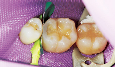 図7 隣接面部の充填が完了したところでスリックバンドを除去し、充填部歯肉側を光重合。以降はこのまま咬合面形態を作っていく。