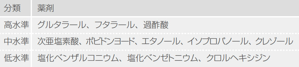 汚染が確認されたときは当然であるが患者ごとにも清拭と消毒が必要である。消毒には中、低水準消毒薬を使用する4、5)。