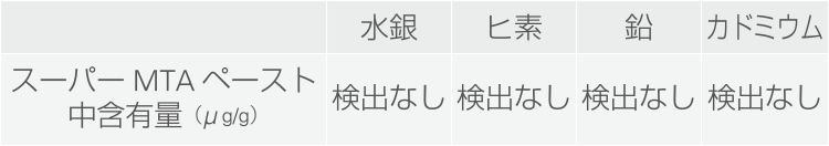 MTAは、天然の鉱物を原料にして製造されるポルトランドセメントをベースにしており、健康や環境に影響があるとされる重金属が不純物として含まれていることが報告されている10)。歯科においては、重金属の含有量が規制されている材料もあり、極力重金属を含まない方が望ましいと考えられる。そこで、スーパーMTAペーストには国内工場で合成し、重金属の含有を極限まで抑えた高純度ポルトランドセメントを採用した(表2)。