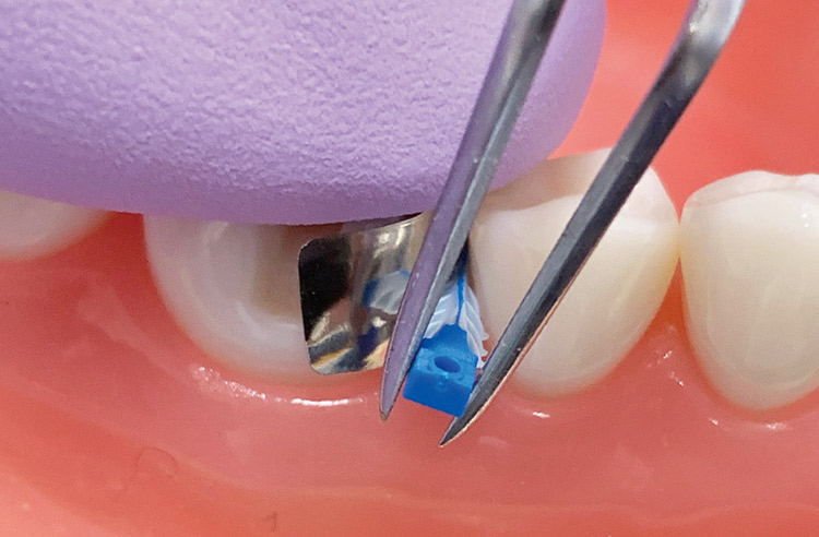 図6 バンドを軽く指で保持しながら、フュージョン ウェッジ スモール(ブルー)をピンセットで把持し下部鼓形空隙に挿入。