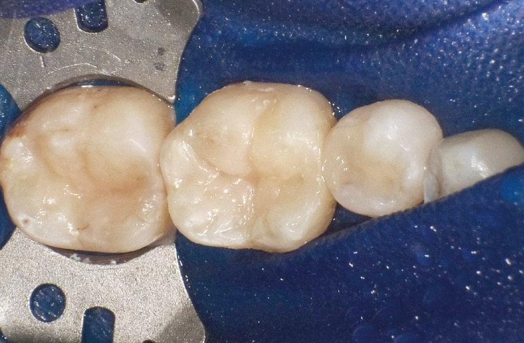 2. ラバーダム防湿とメタルインレー除去。ラバーダム防湿後、メタルインレーを除去する。咬合面窩底部に感染象牙質が認められる(図18)。