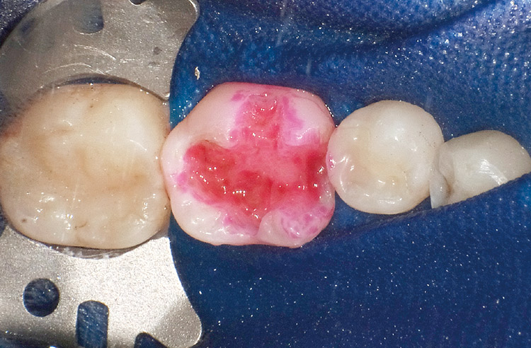 3. う蝕象牙質の検知。う蝕検知液(カリエスディテクター:クラレノリタケデンタル)により、感染象牙質を染色する(図19)。