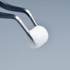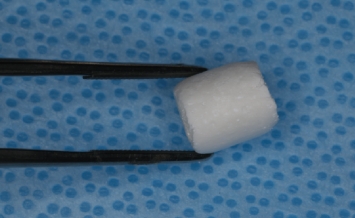 本品は顆粒ではなく、スポンジ状の、円盤形(ディスク)、および円柱状(ロッド)の2種類の製品形状となっています。吸水時は柔軟性を持つことから、容易に変形し、様々な形の骨欠損部にご使用いただけます。