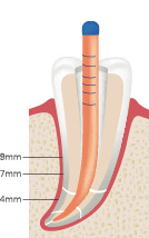 シーラーを塗布したメインポイントを根管に挿入し、根管壁に塗り残しが無いように十分塗布し、メインポイントを作業長に位置づけます。