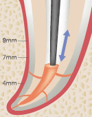 チップ先端を作業長から4~7mmのところまで1.0~2秒かけて加熱・加圧します。根尖部分をしっかりと充填するために作動ボタンを離した後も8秒間加圧状態を維持します。