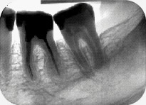 現像・定着液の温度が低い場合や液が古い場合、あるいはX線の線量が低い場合は写真が薄くなります。この例では根尖を確認することができません。